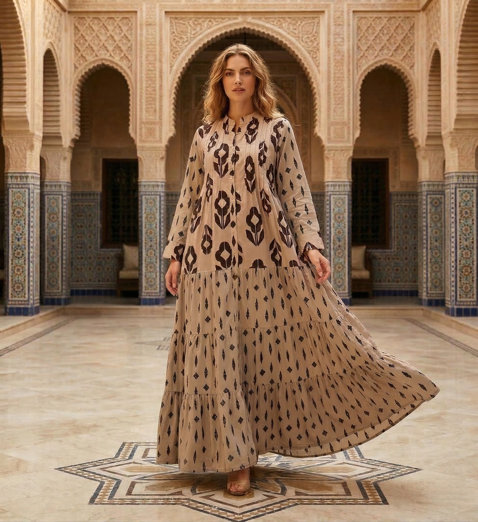 A striking beige tiered dress detailed with bold, dark brown abstract and geometric motifs for a modern, earthy look.