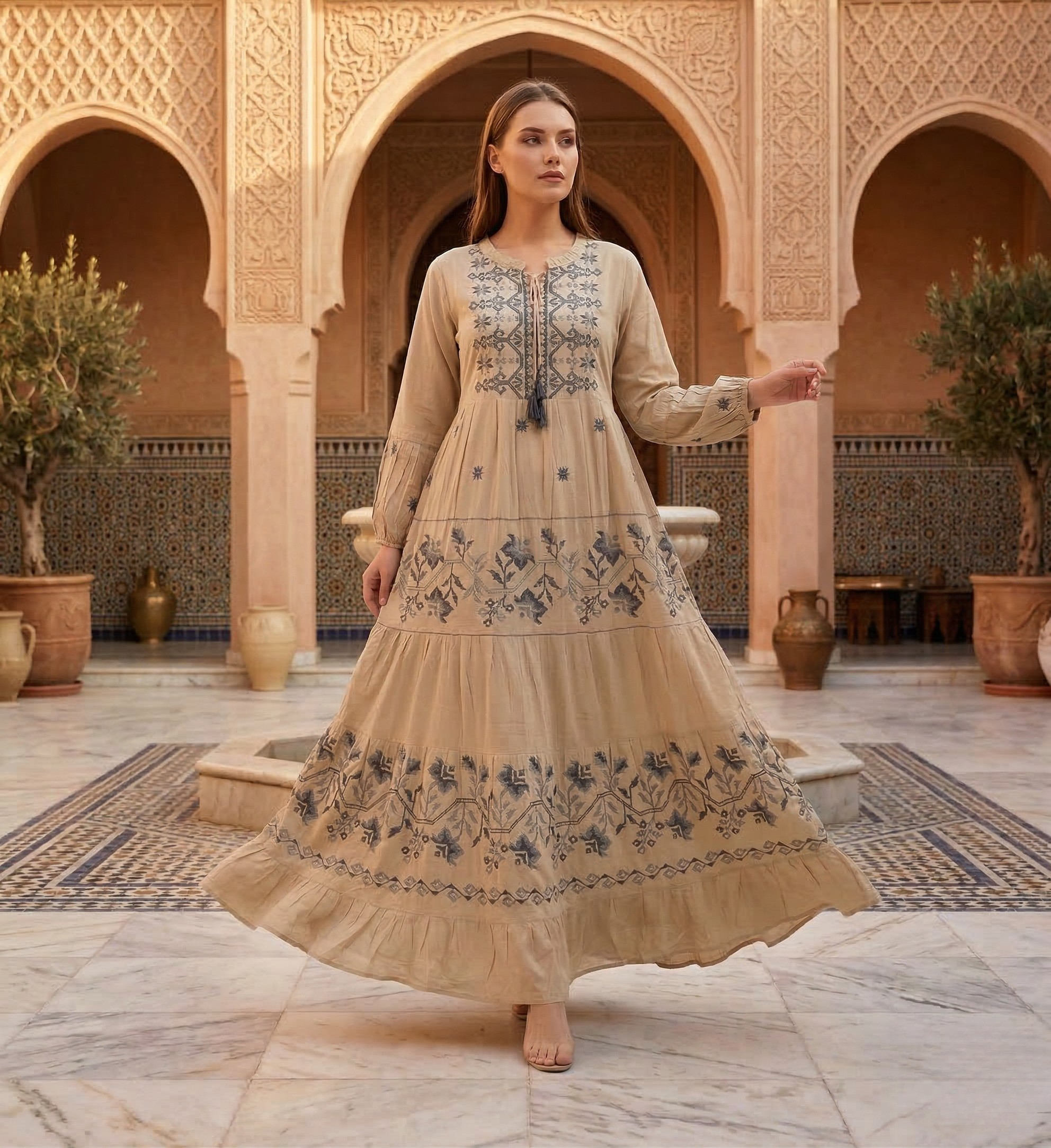A beautifully understated beige maxi dress featuring vintage-inspired blue floral embroidery along the tiers and a tassel tie neckline.