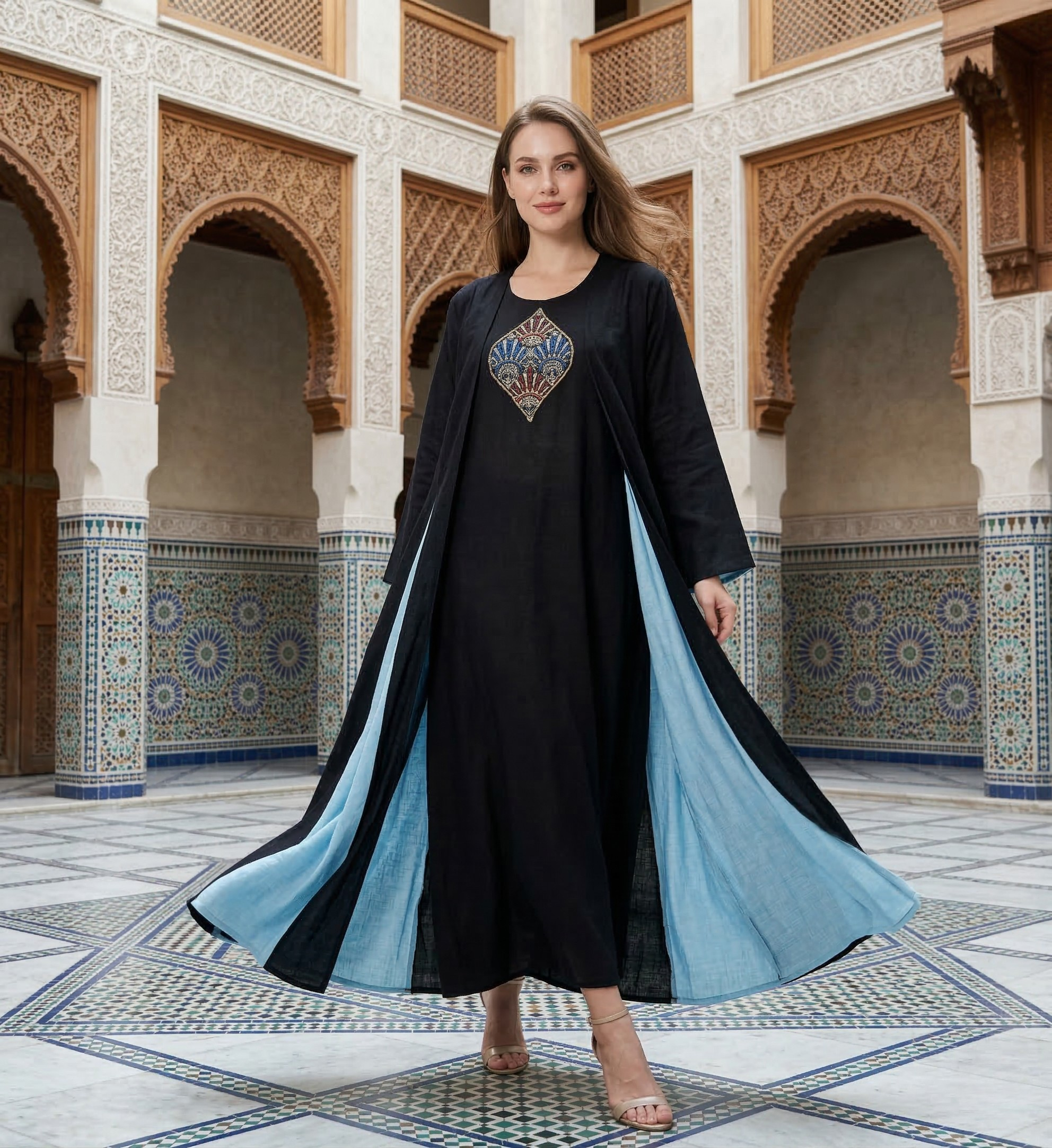 A striking black A-line dress featuring a beautifully beaded chest motif and dramatic azure blue contrast panels that reveal themselves as you walk.