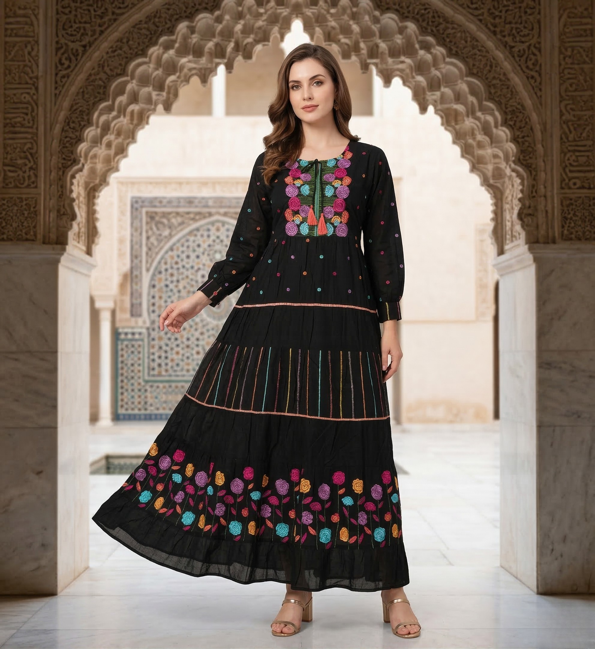Elegant black tiered maxi dress featuring striking, multicolored floral embroidery along the neckline and hem. Perfect for evening social gatherings.