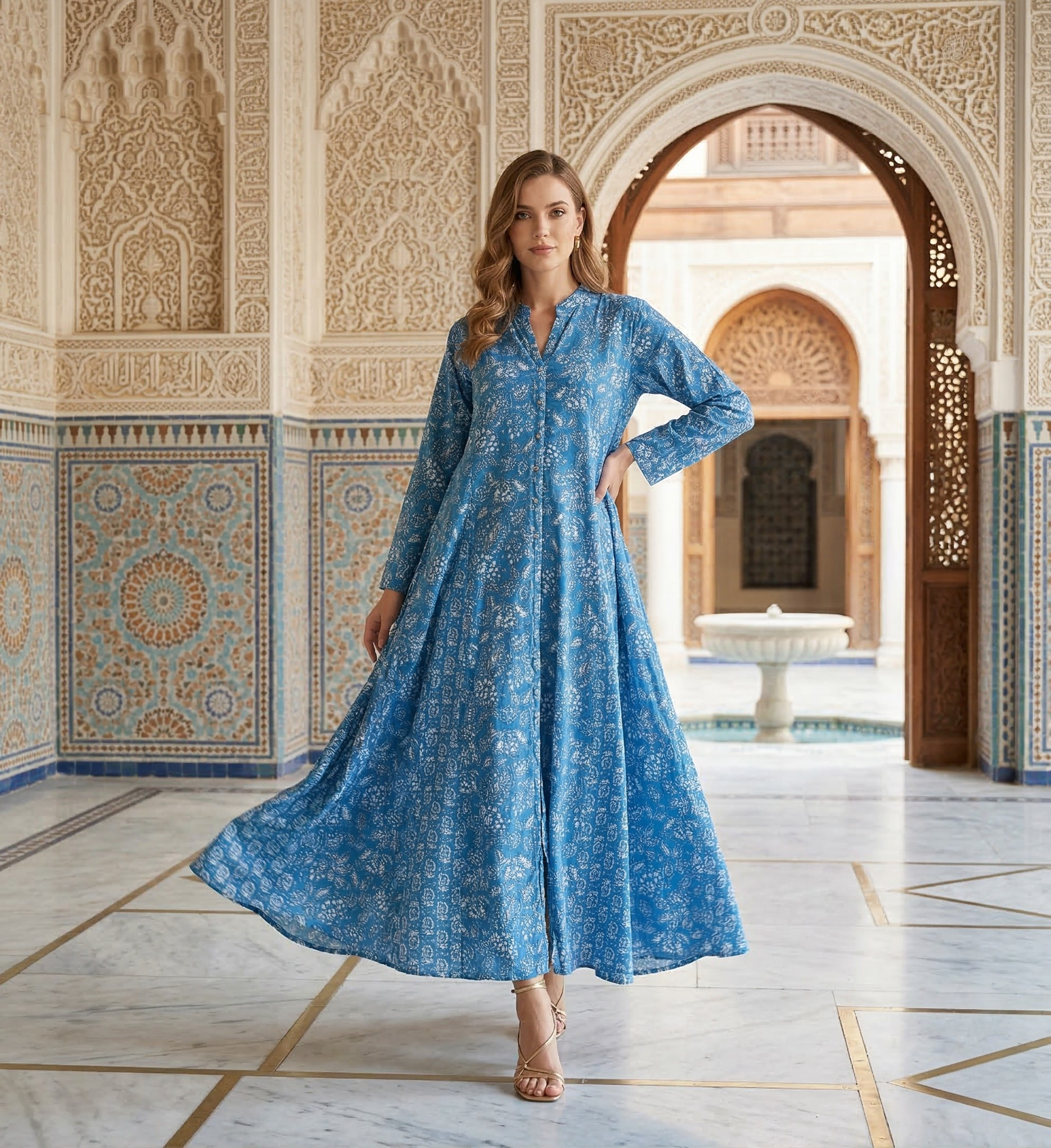 An effortlessly chic blue flared maxi dress featuring a button-down style front and a delicate white botanical print.