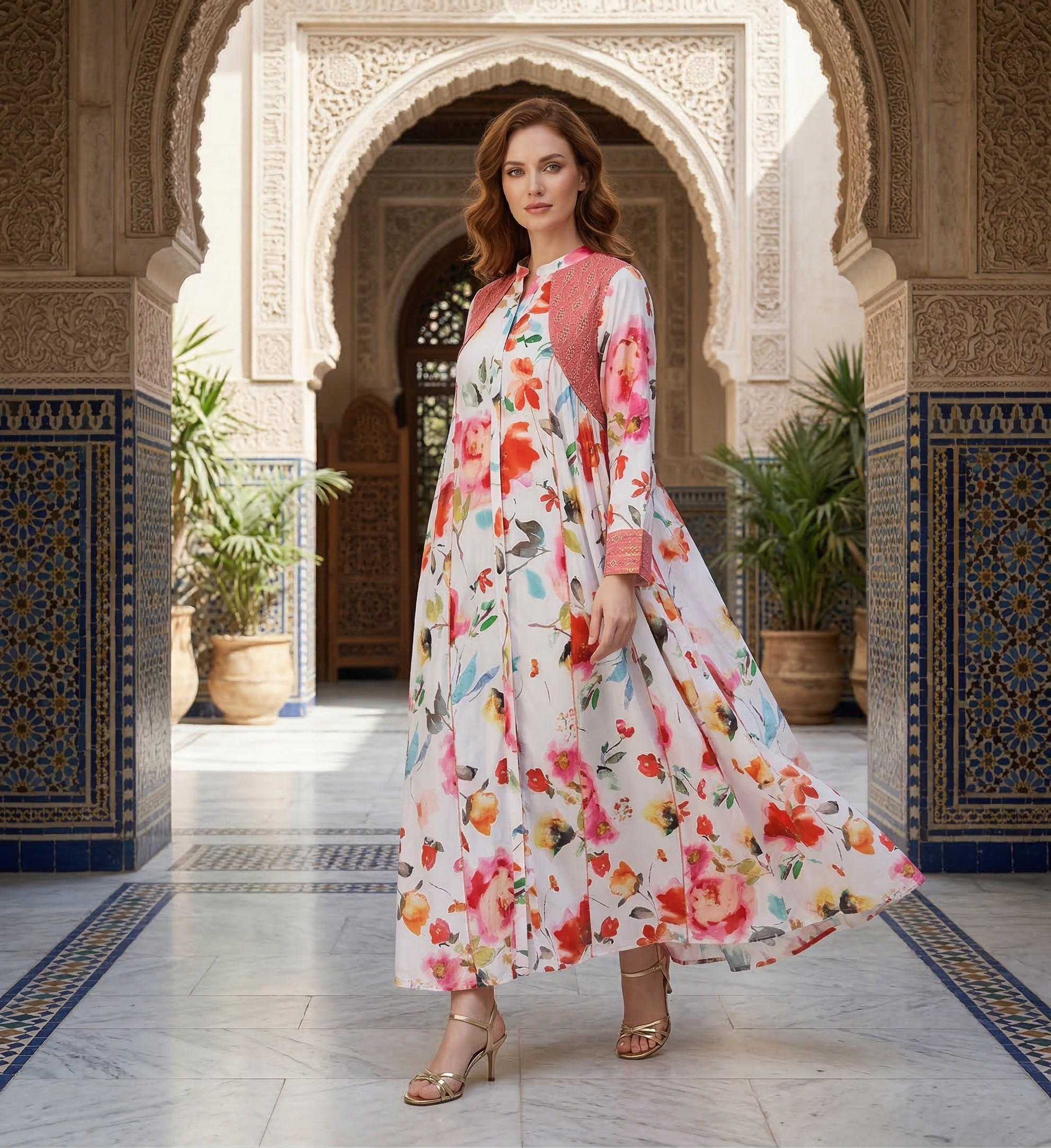 A stunning white A-line dress showcasing a bold, bright watercolor floral print and contrasting yoke detailing.