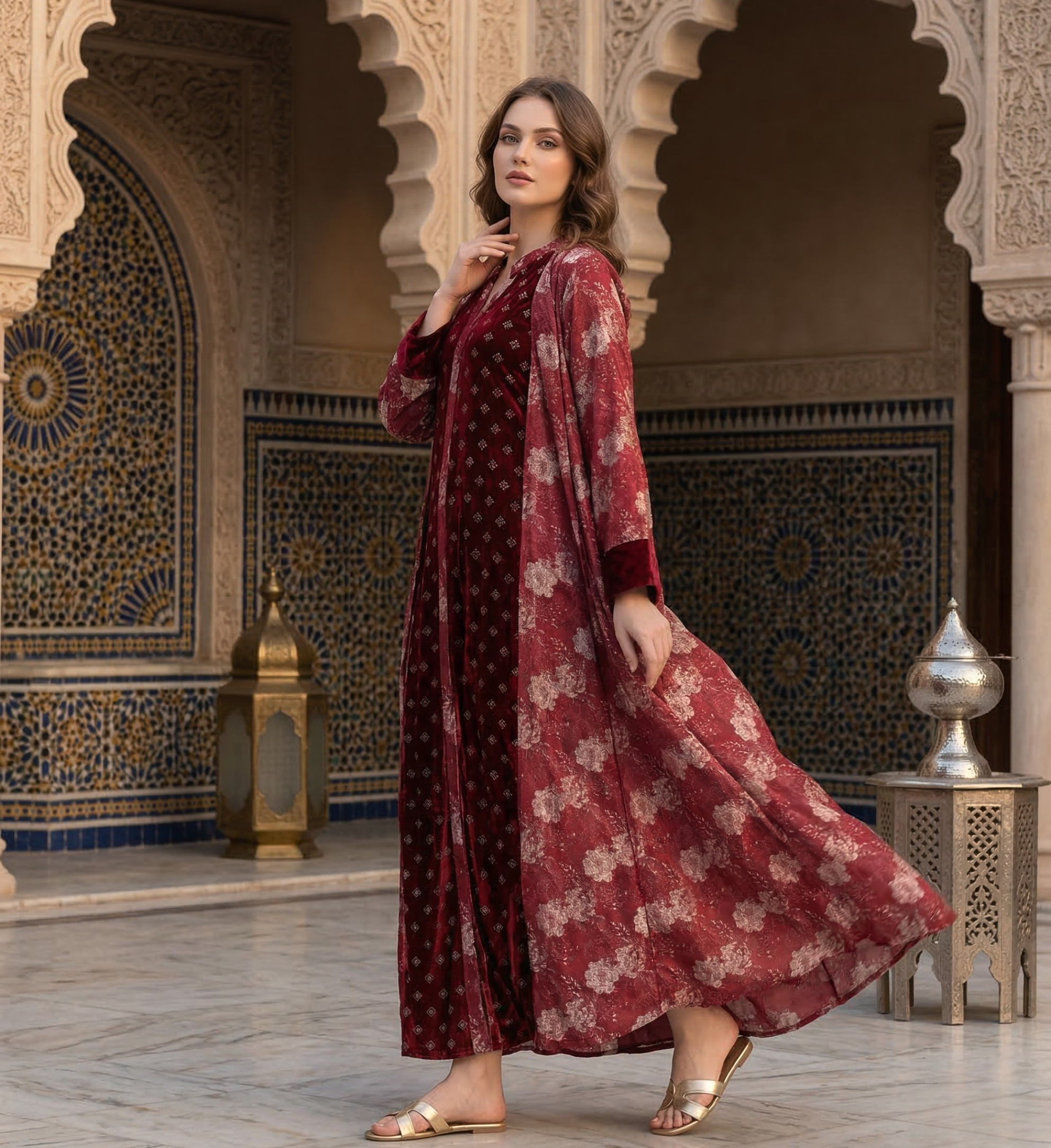 An exquisite two-piece ensemble featuring a rich burgundy geometric-patterned velvet inner dress paired with a sheer, flowing floral overlay jacket.