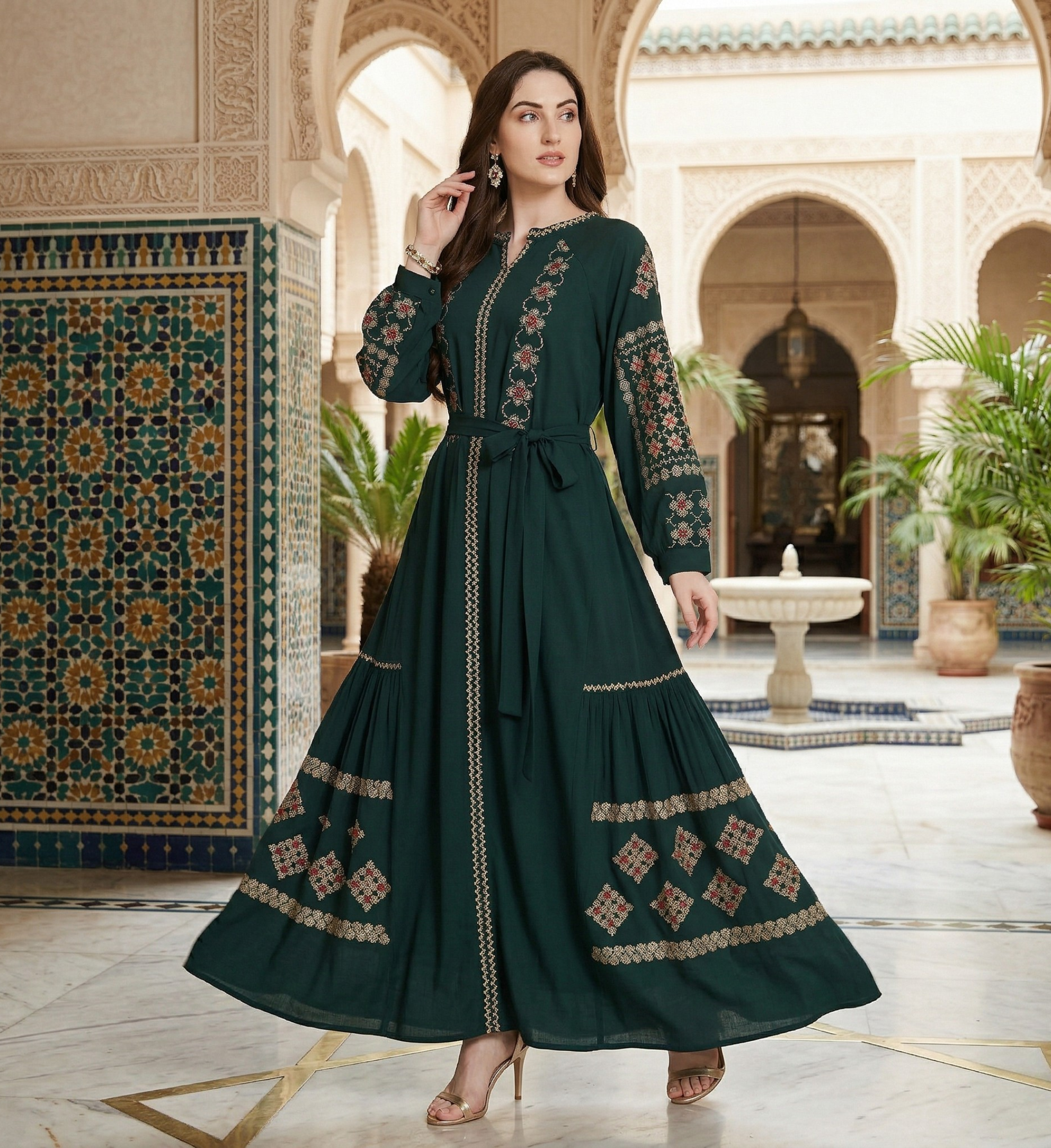 A rich dark emerald green flared cotton dress detailed with intricate geometric diamond patterns on the sleeves and lower skirt panels, finished with a matching waist tie.