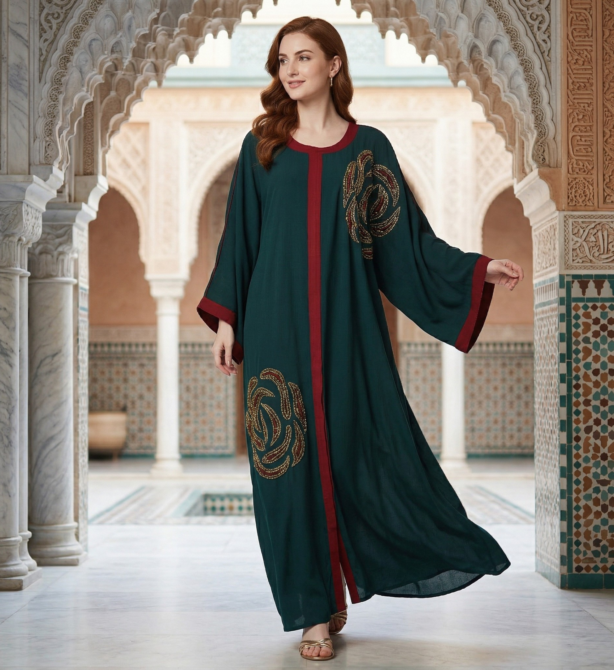 A regal emerald green kaftan-style dress accented with deep red vertical piping and magnificent, large-scale gold hand-embellished swirl motifs.