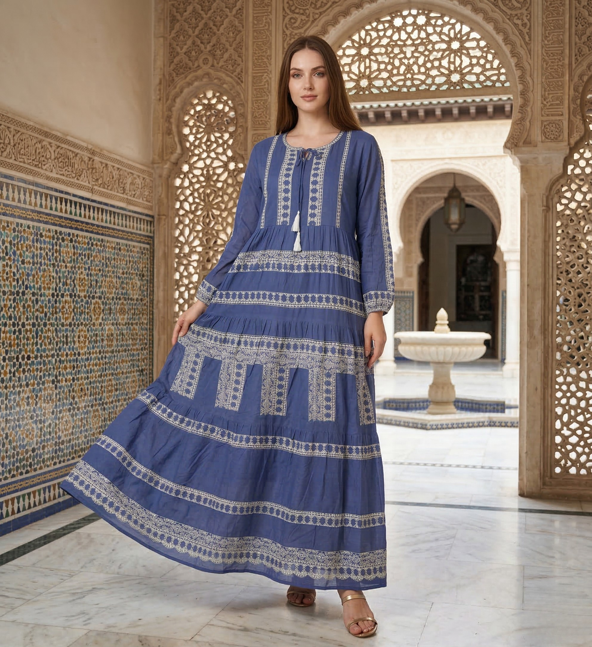A sophisticated indigo blue tiered maxi dress detailed with crisp white geometric embroidery and a tassel neckline. Ideal for daytime social events.