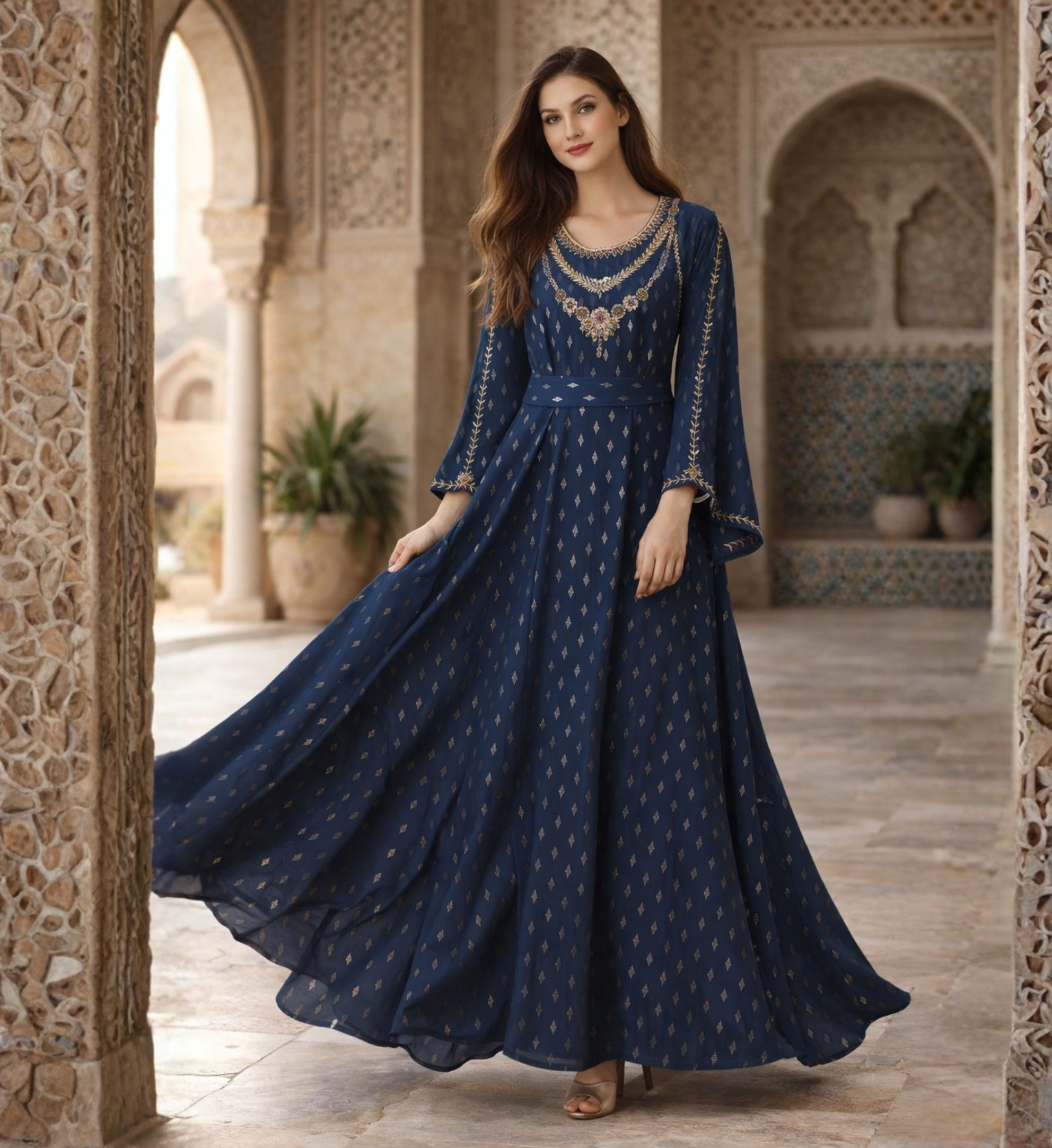 A stunning midnight blue flared dress featuring all-over subtle geometric gold prints and a heavily hand-embellished regal neckline.