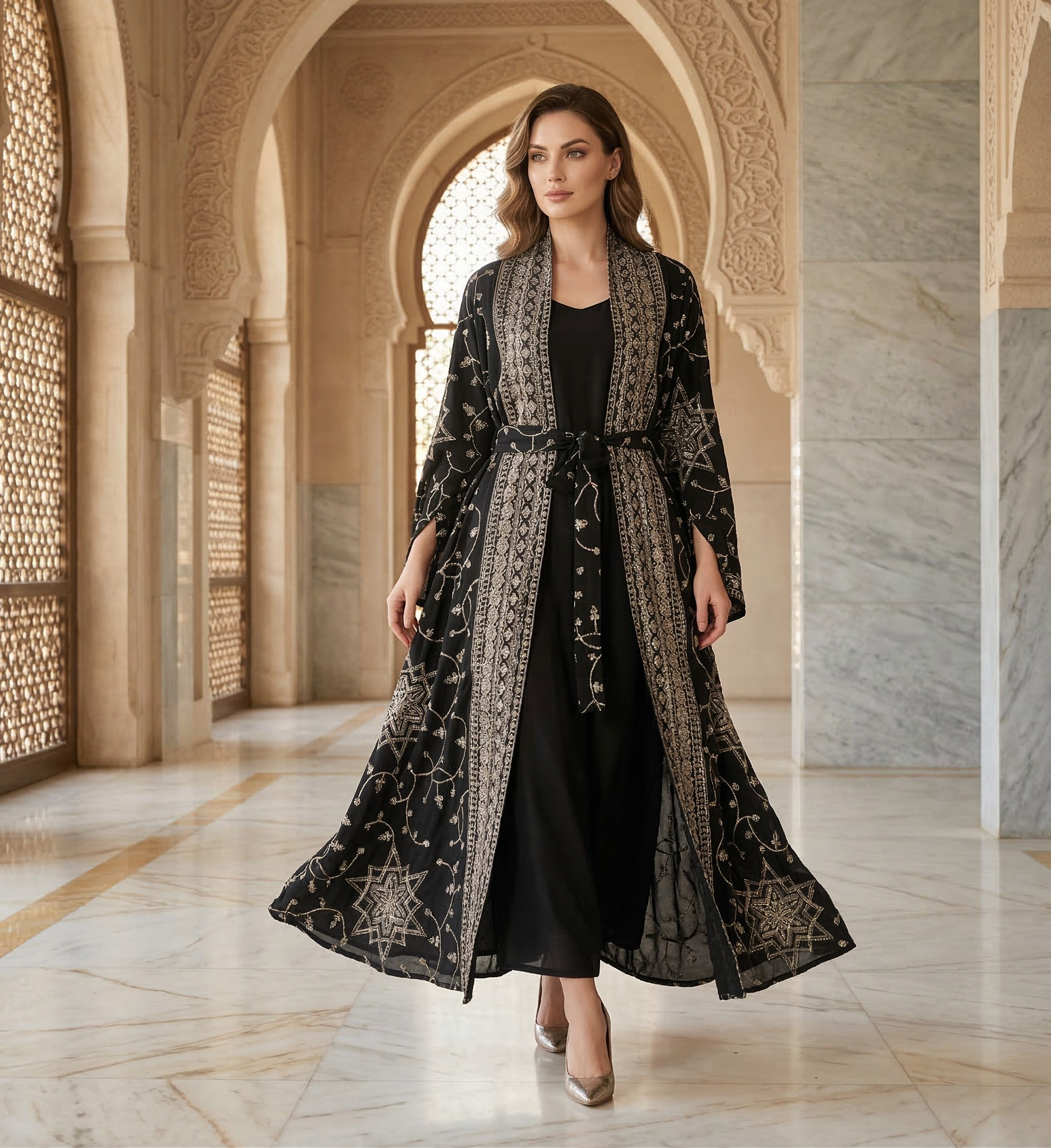 A striking black two-piece ensemble featuring a sheer overlay jacket beautifully embroidered with gold geometric starburst patterns.