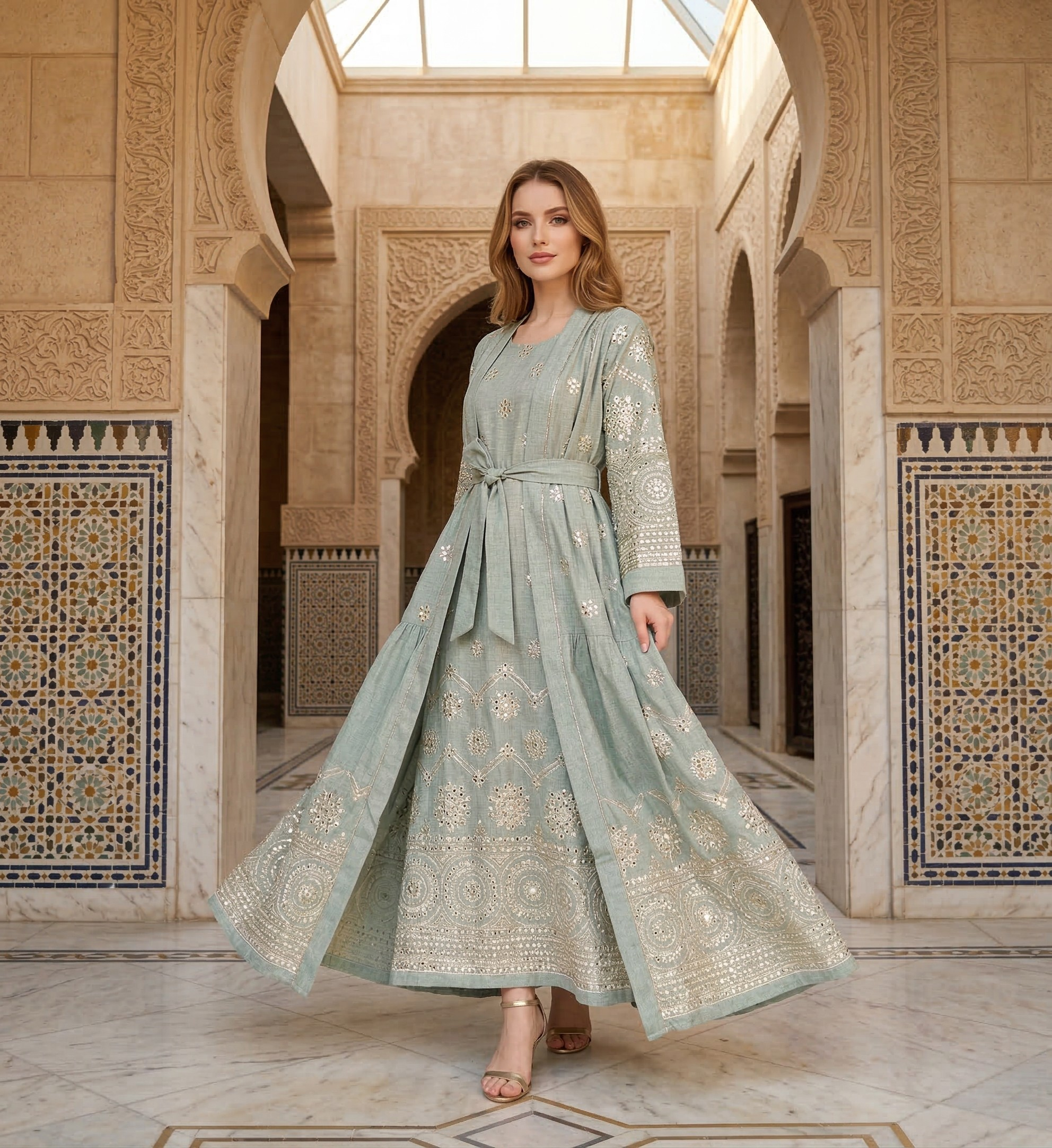 A premium mint green flared dress featuring a stunning overlay effect, heavily detailed with intricate mirror-style foil and thread embroidery.