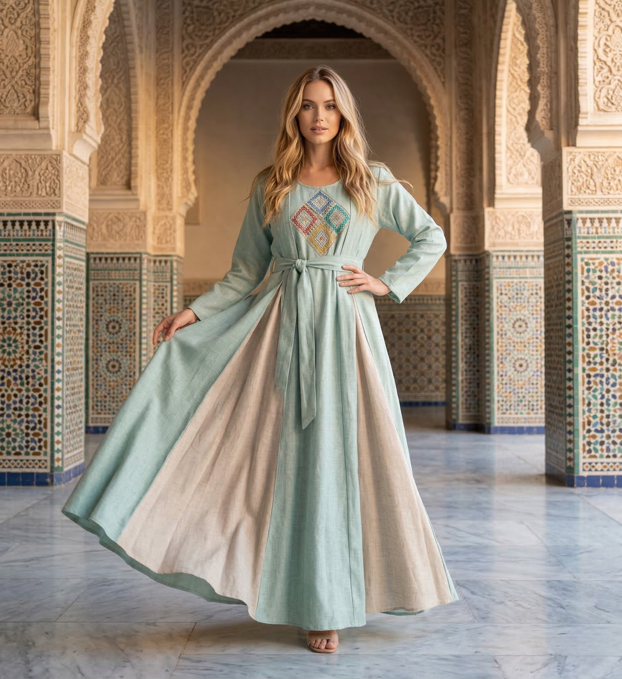 A beautifully tailored A-line dress featuring a unique mint and sand color-blocked design, complete with a waist tie and embroidered chest detail.