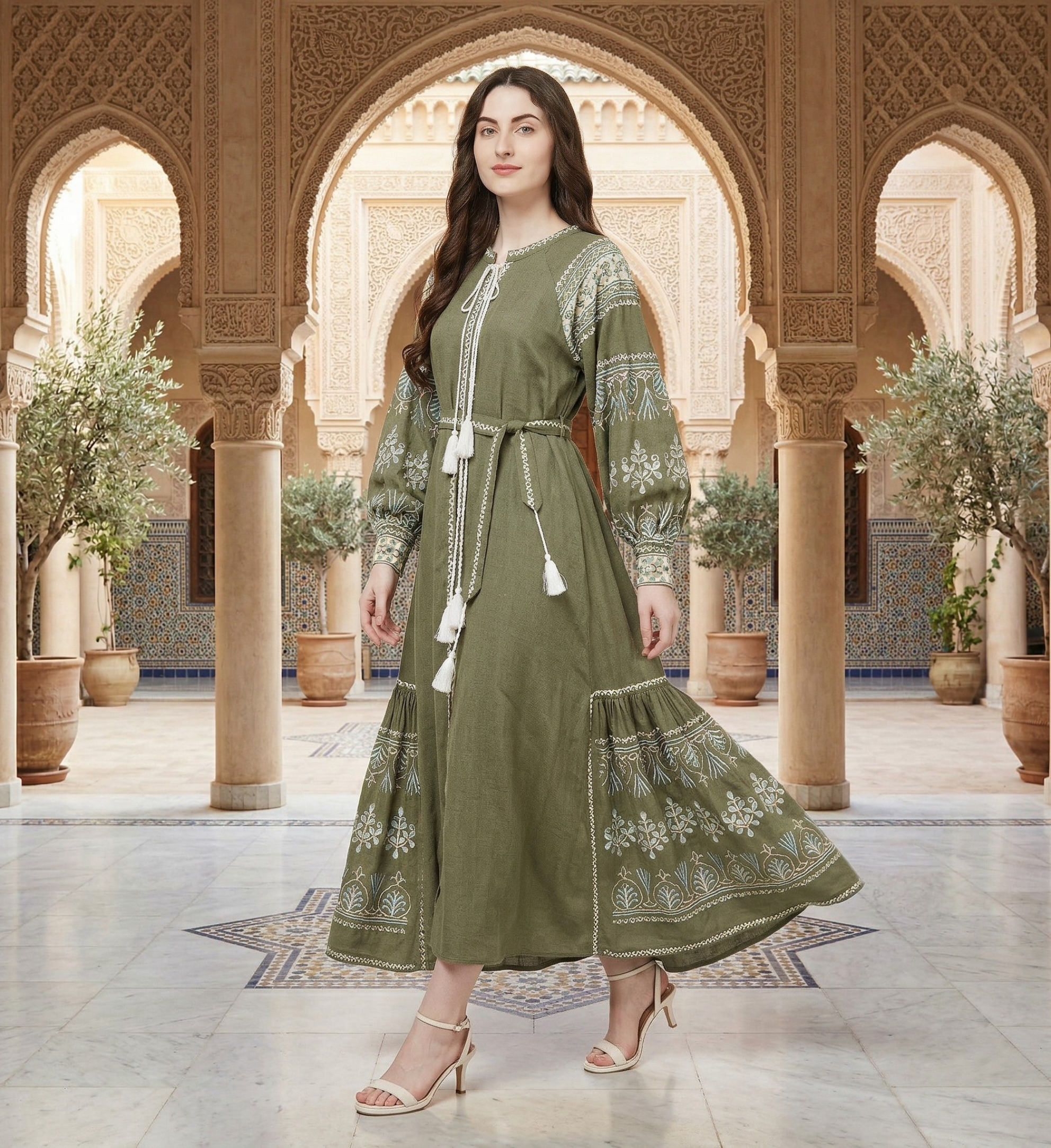 An earthy olive green cotton maxi dress featuring delicate white and light blue botanical patterns on the sleeves and skirt, tied together with a contrasting white tassel belt.