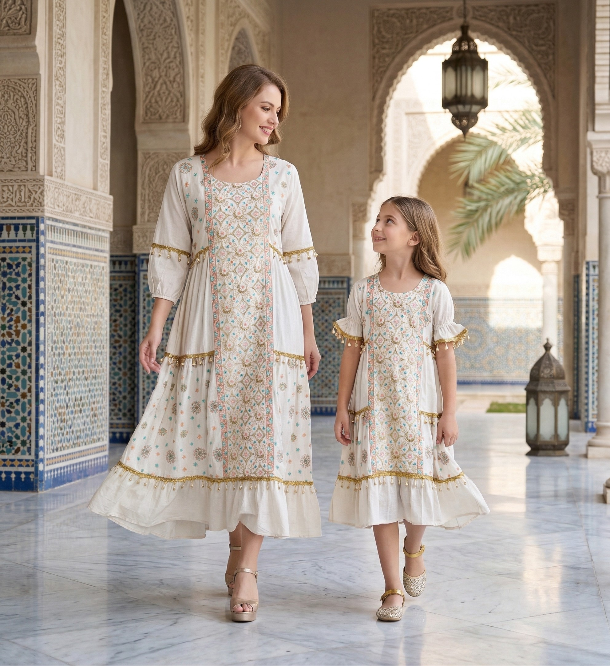 Beautiful off-white matching dresses for mother and daughter featuring intricate pastel embroidery and premium gold fringed finishing. Ideal for festive retail collections.