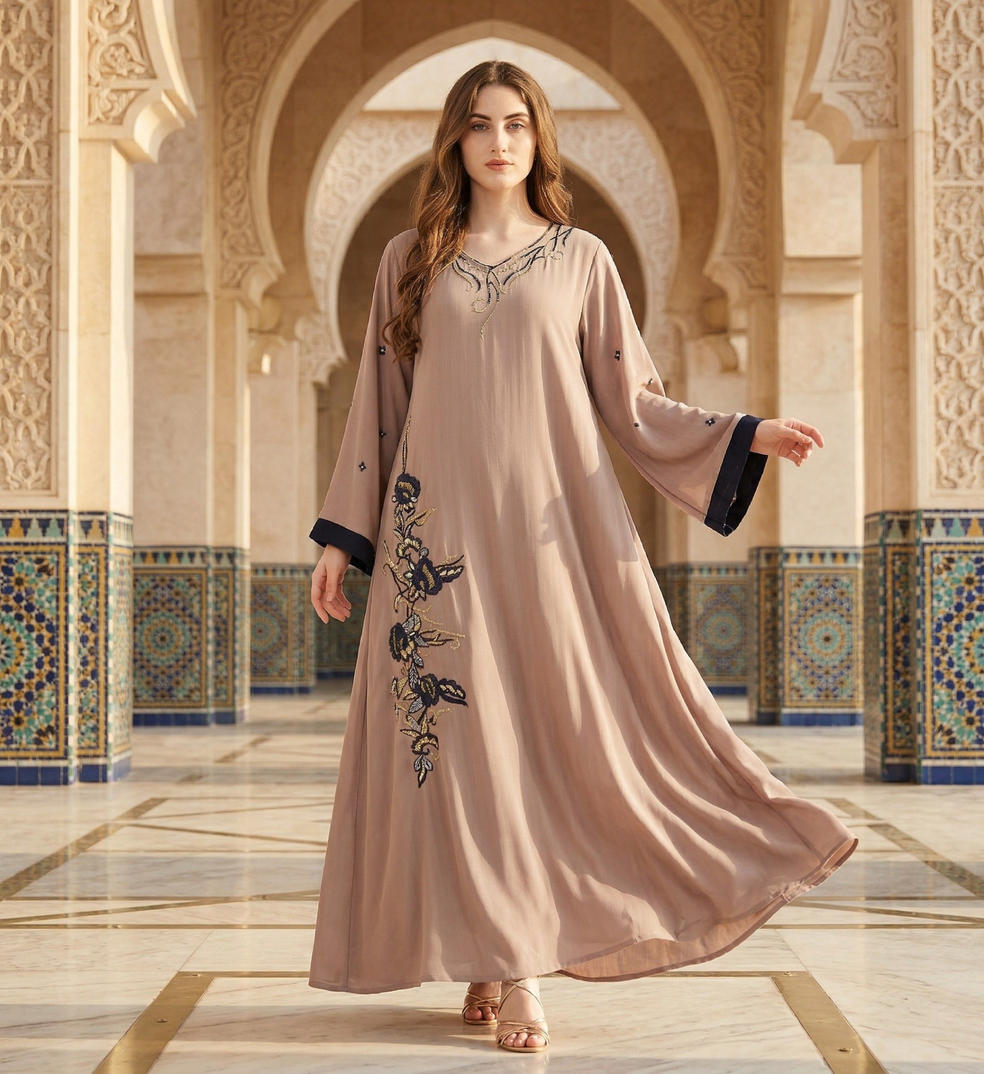 A graceful taupe flared maxi dress featuring striking navy blue cuffs and a beautifully hand-embellished asymmetrical floral vine climbing the skirt, complete with a delicately beaded neckline.