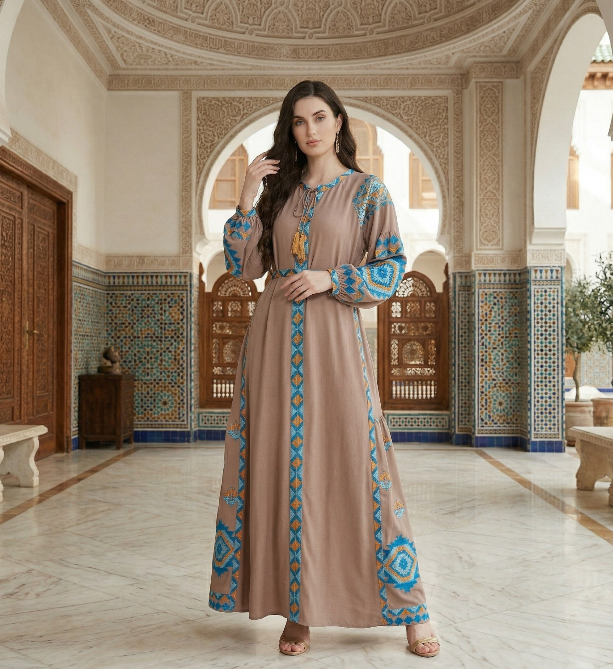 A beautiful taupe cotton maxi dress featuring striking blue and gold geometric patterns along the front placket, balloon sleeves, and hem, complete with a waist tie.