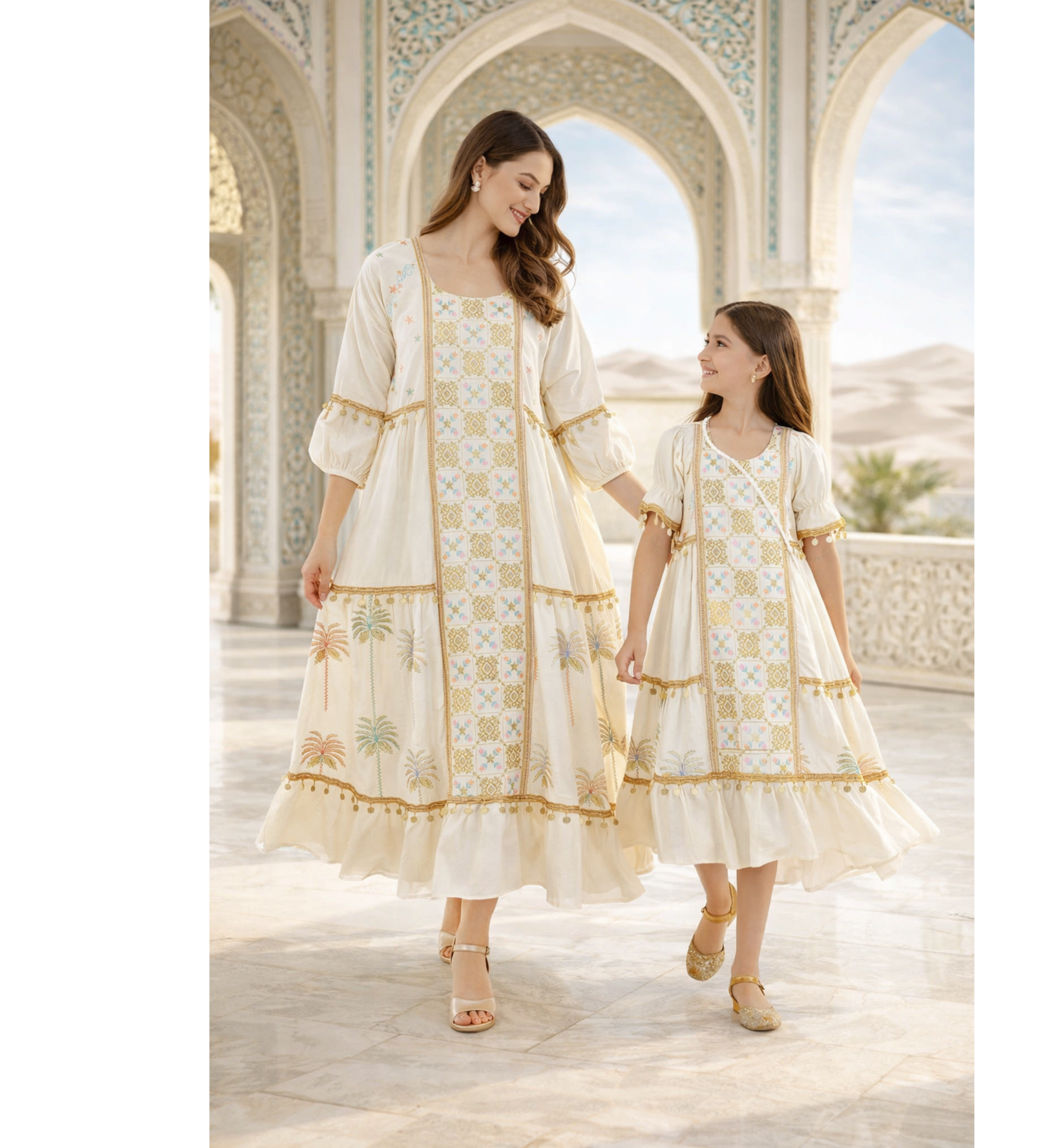 Beautiful off-white matching dresses for mother and daughter featuring unique palm tree motif embroidery and elegant coin accents. Ideal for festive retail collections.