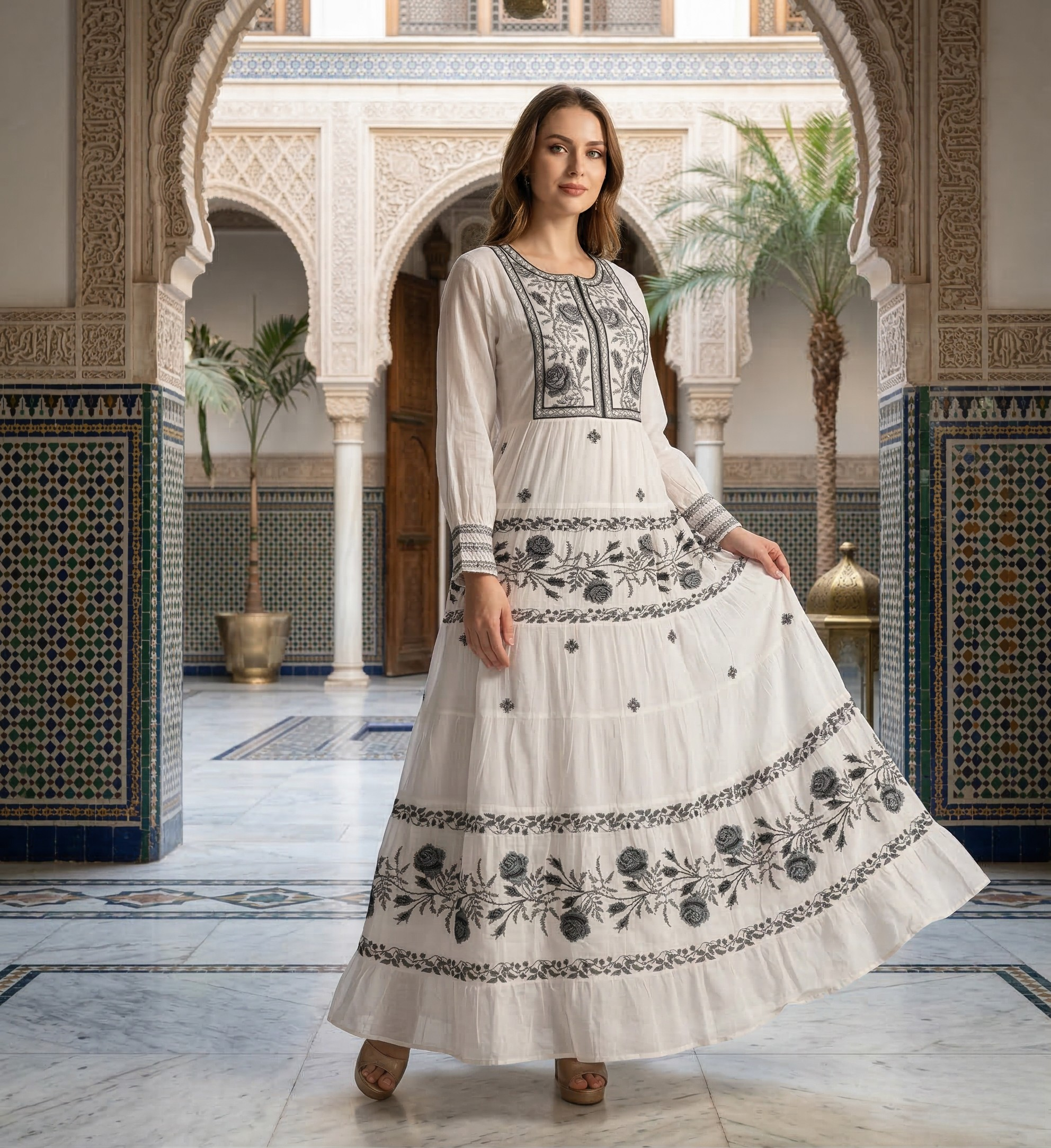 An elegant white tiered maxi dress featuring intricate charcoal floral and vine embroidery across the bodice and tiered skirt.